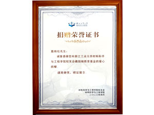 葛炳灶先生向浙江工业大学捐赠荣誉证书