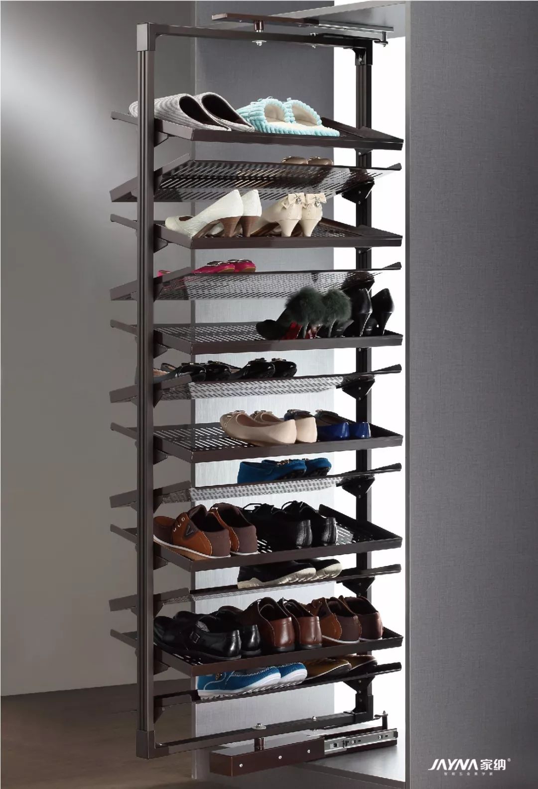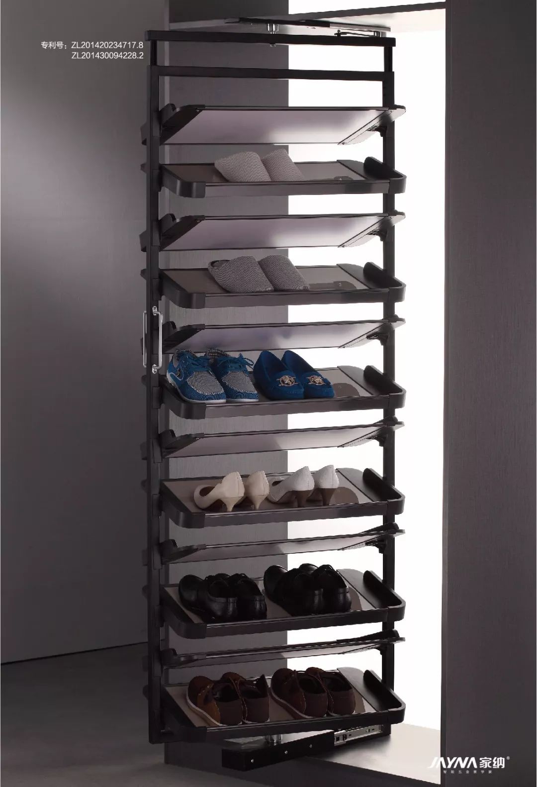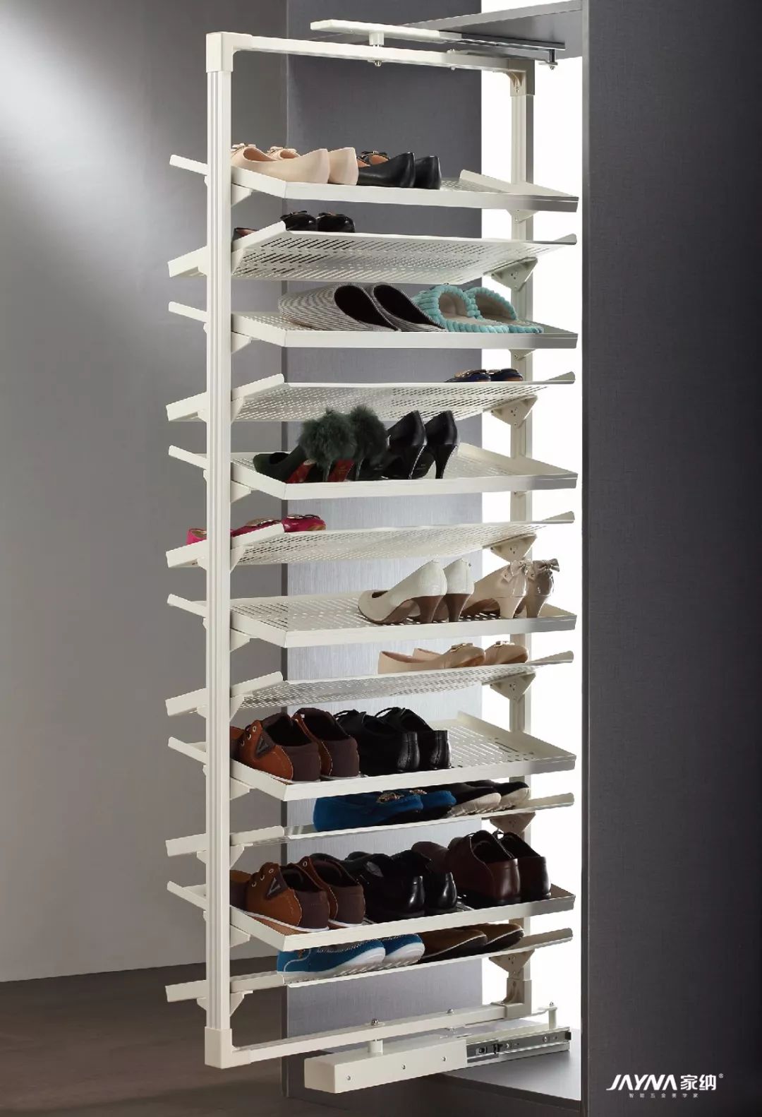 家纳的 360°旋转鞋架从外观看起来和普通鞋架差不多,但其实是内有乾坤,它的巧妙之处在于内部旋转鞋架的设计。当你想要拿鞋子时,打开鞋柜,轻轻一拉,鞋架便可以180度旋转,极其方便收纳和拿取。360°旋转鞋架充分利用了鞋帮和鞋面的高度差,内部搁板呈Z字形排布,容量几乎是普通鞋架的2倍。