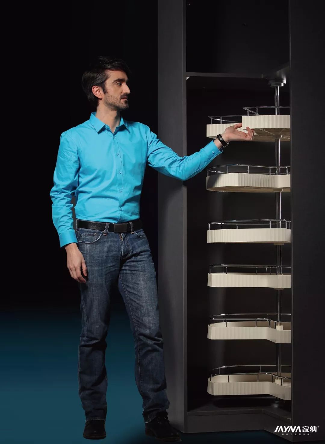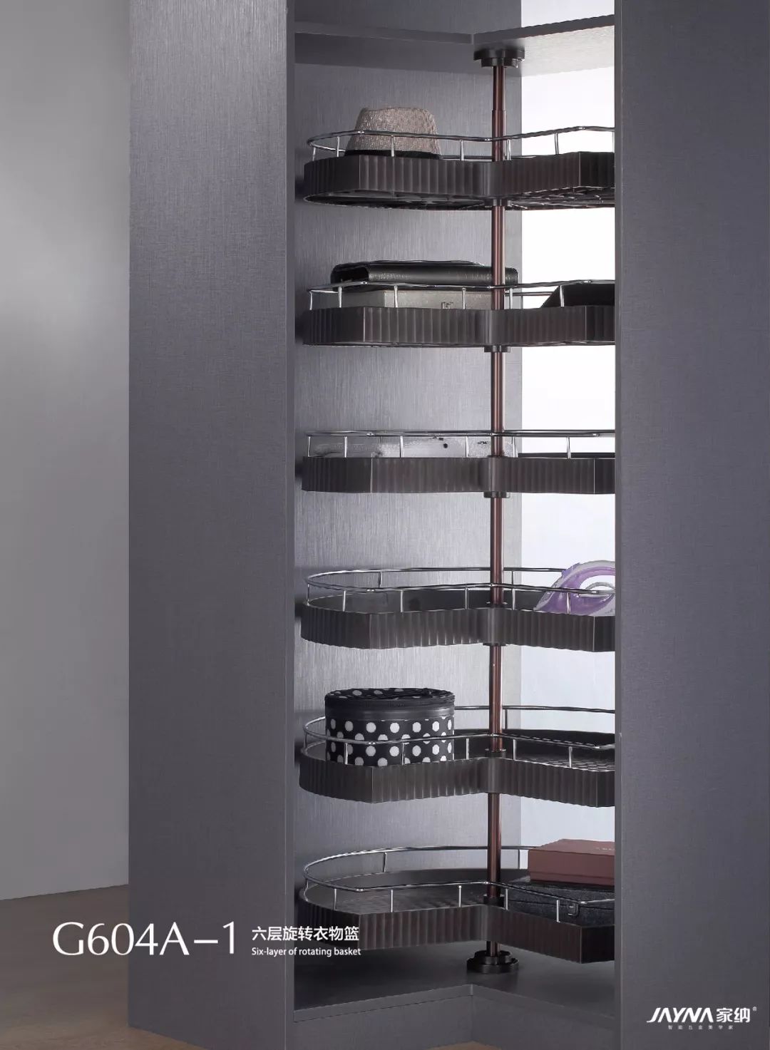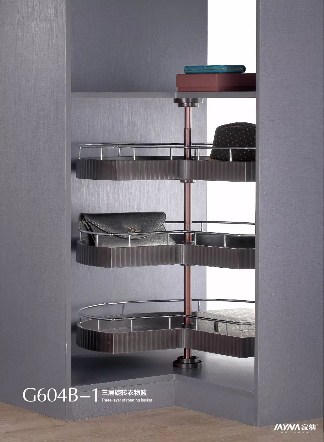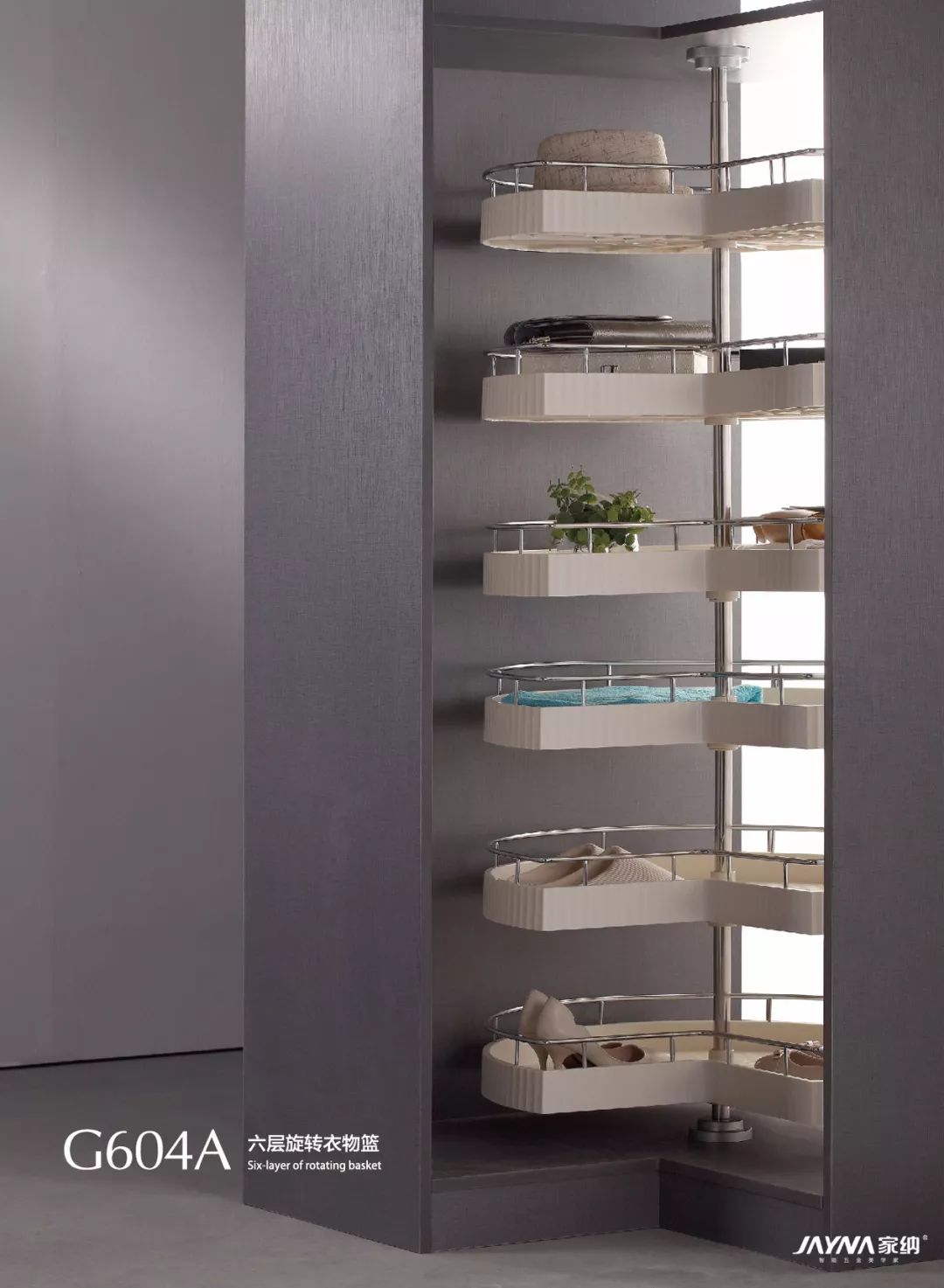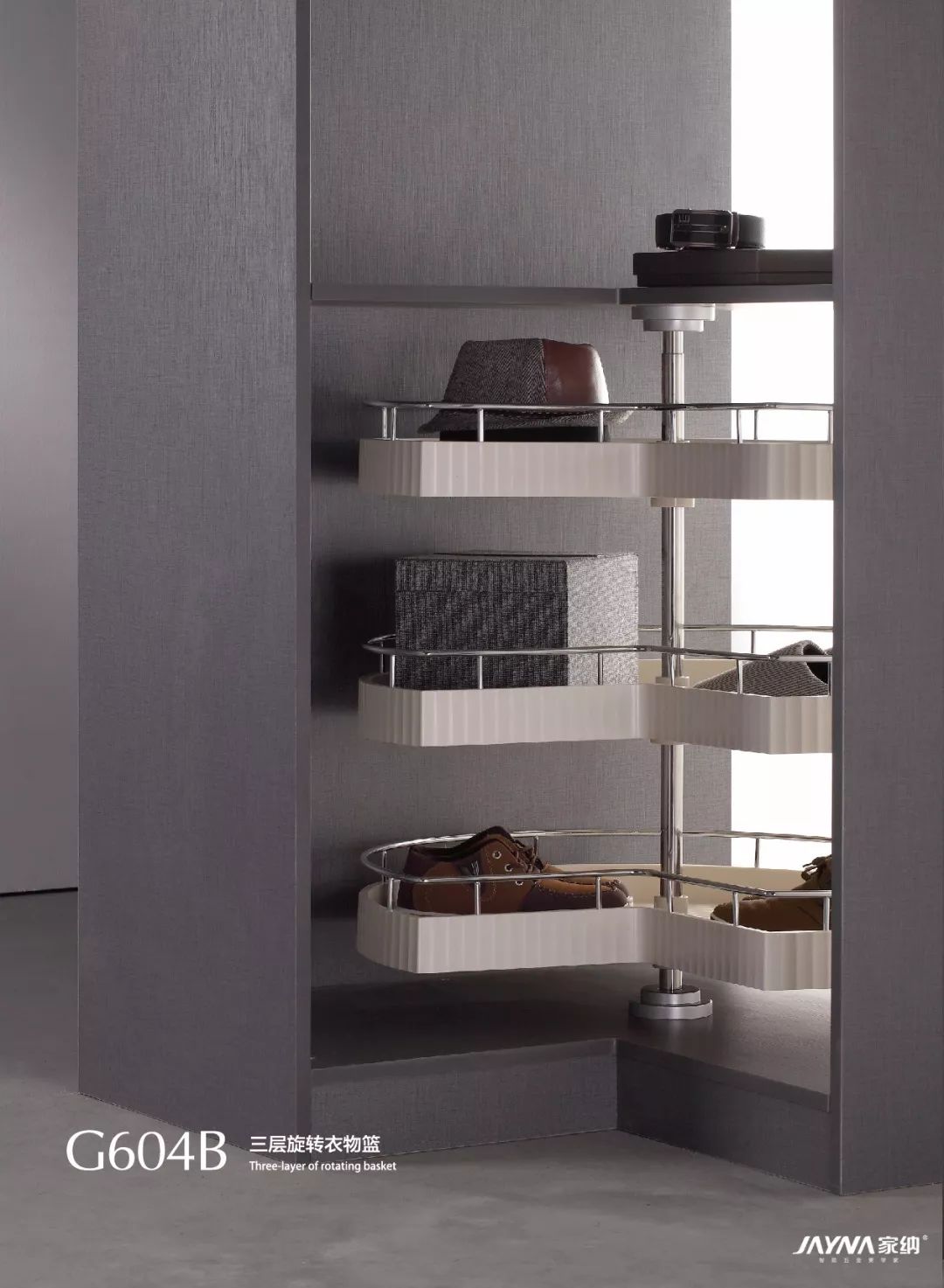 家纳衣柜转角系统采用的是能360°旋转的衣架、裤架、收纳架,三种收纳功能可根据需求个性搭配,就算是转角的狭小空间,上、中、下都能得到合理的运用。家纳衣柜转角系统内部存放量比较大,利用这种方式来垂挂衣服,挂衣量是传统衣柜的三倍。衣物可以360°随意转动,存取极为方便,衣物分类一目了然。