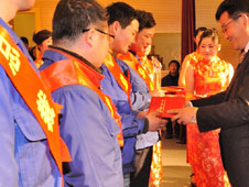 公司董事长兼总裁葛炳灶为先进员工颁奖